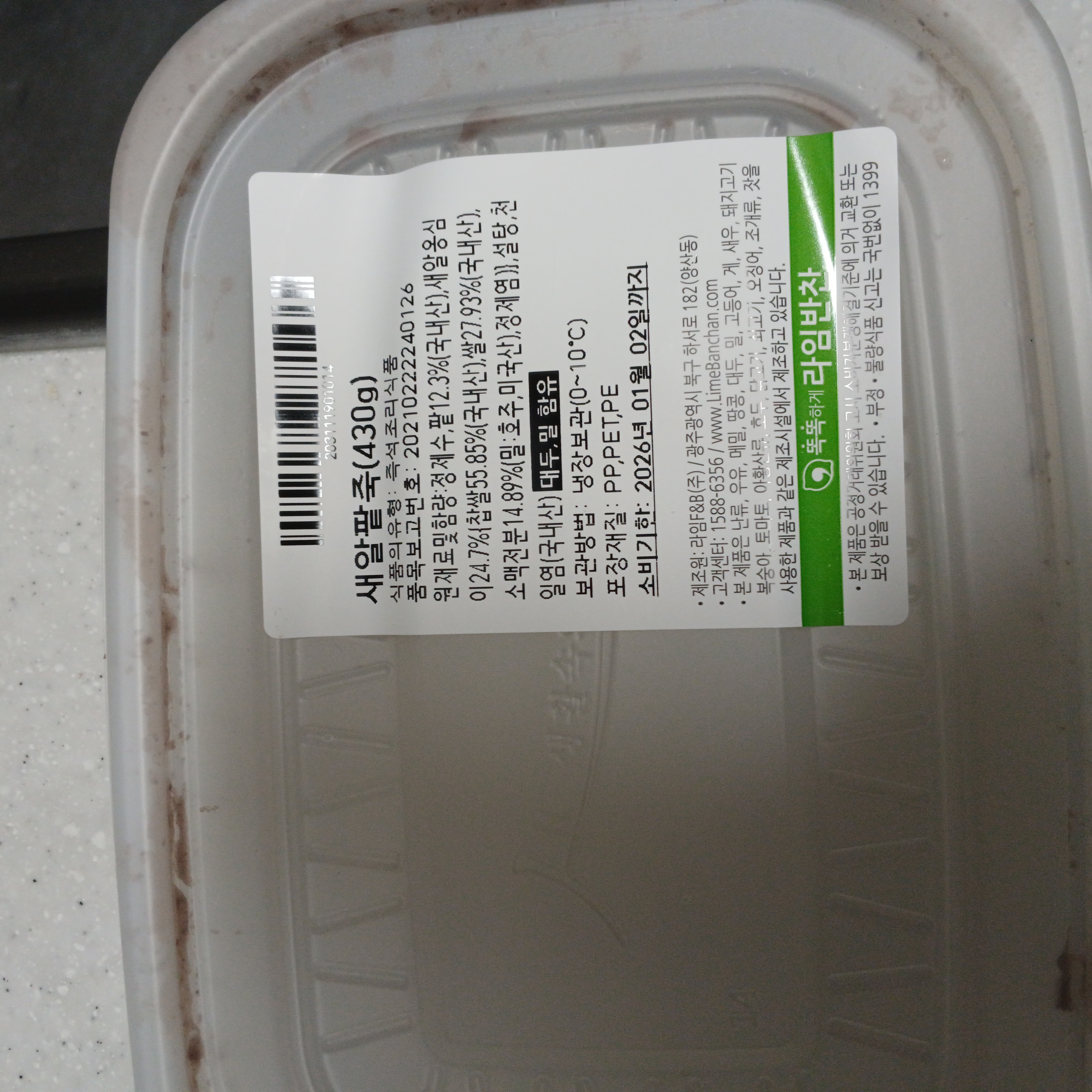 | 원재료명 및 함량 | 정제수,팥12.3%(중국산),새알옹심이24.7%{찹쌀55.85%(국내산),쌀27.93%(국내산),소맥전분14.89%(밀:호주,미국산),정제염)},설탕1.2%,천일염(국내산)/대두,밀 함유 |