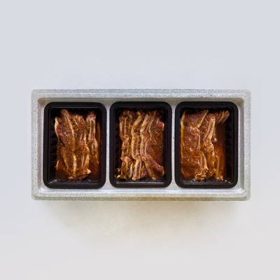| 원재료명 및 함량 | LA갈비58.3%(호주산),불고기양념4.9%{양조간장17.8%(대두:수입산),백설탕12.7%,양파청,사과,배,양파,대파,마늘},양파0.5%(국내산),파인애플/대두,밀,쇠고기 함유 |