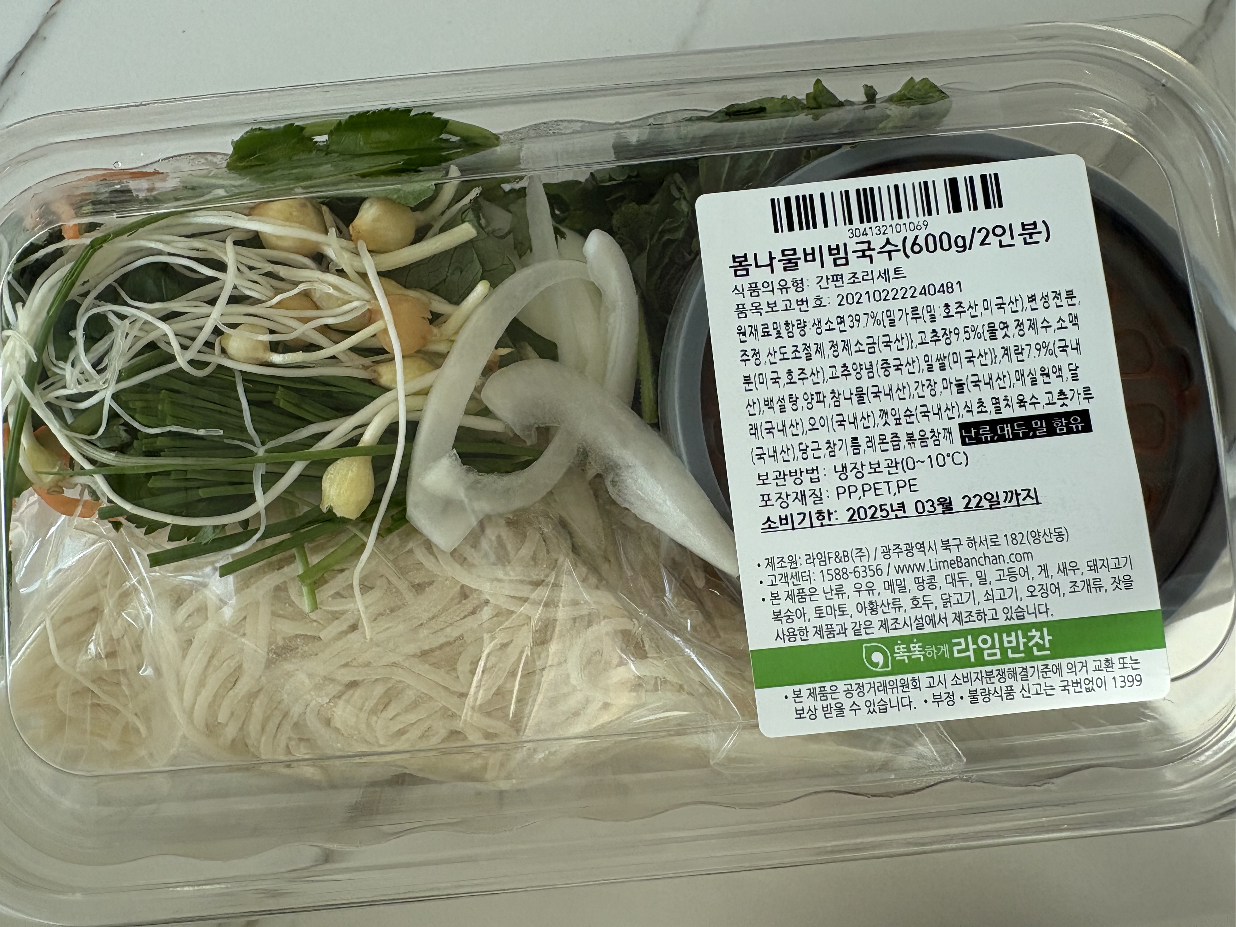 | 원재료명 및 함량 | 생소면39.7%{밀가루(밀:호주산,미국산),변성전분,주정,산도조절제,정제소금(국산),혼합제제(D-소비톨액,대두유,레시틴,글리세린지방산에스테르)},고추장9.5%{물엿,정제수,소맥분(미국,호주산),고추양념[고춧가루6.2%,정제소금,마늘,양파/중국산],밀쌀(미국산),정제소금},계란7.9%(국내산),백설탕,양파,참나물(국내산),간장,마늘,매실원액,달래(국내산),오이(국내산),깻잎순(국내산),식초,멸치육수,고춧가루(국내산),당근,참기름,레몬즙,볶음참깨/ 난류,대두,밀 함유 |