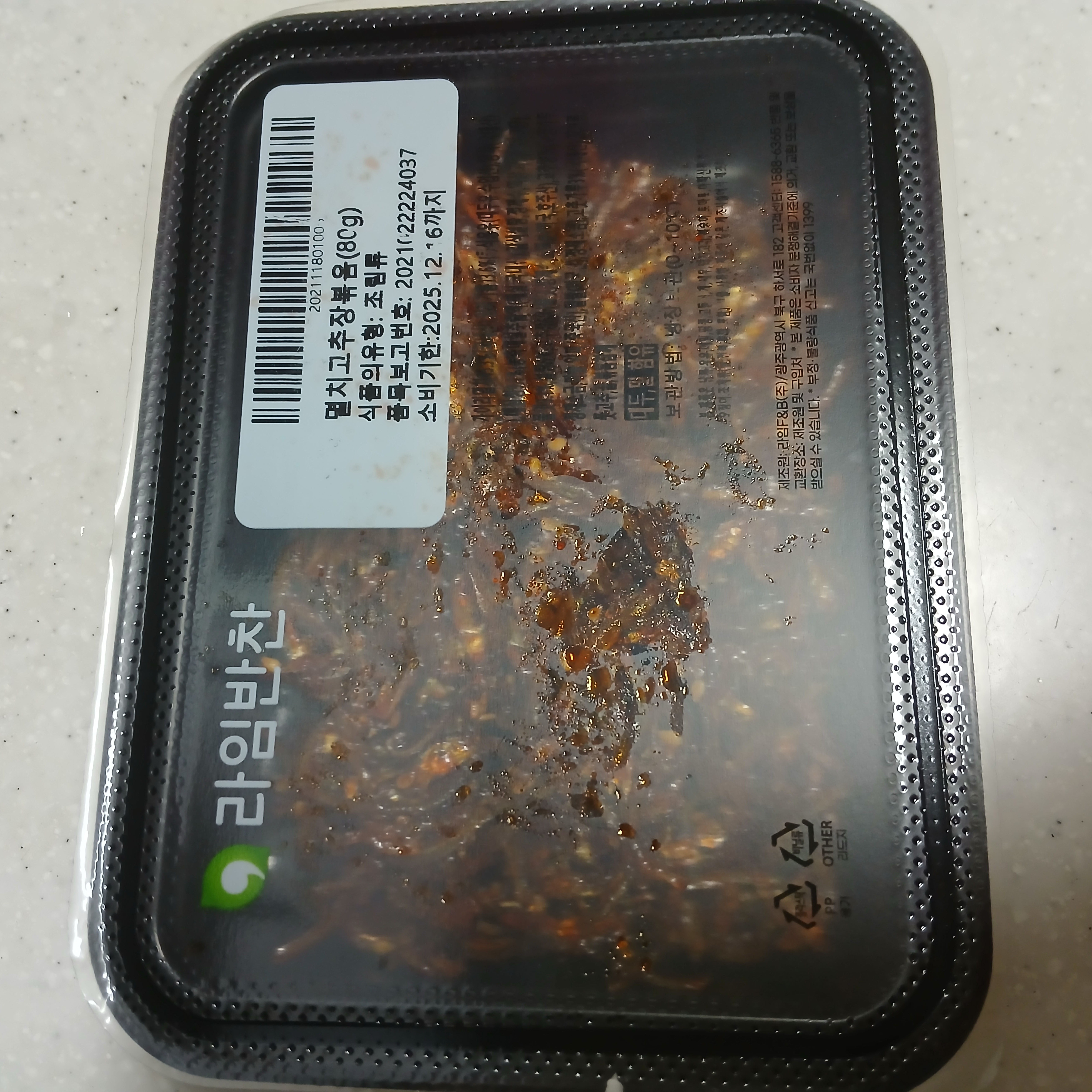 | 원재료명 및 함량 | 가이리멸치45.3%(국내산),양파기름13.6%{콩식용유(대두유:수입산),양파(국내산)},매실청9.1%{농축매실추출액(매실:국내산),갈색설탕,정제수,액상과당,올리고당},물엿9.1%,설탕6%,고추장6%{물엿,정제수,소맥분(미국,호주산),고추양념[고춧가루6.2%,정제소금,마늘,양파/중국산],밀쌀(미국산),정제소금},고춧가루3%(국내산),참기름2.4%,풋고추2.4%,꿀,볶음참깨/대두,밀 함유 |