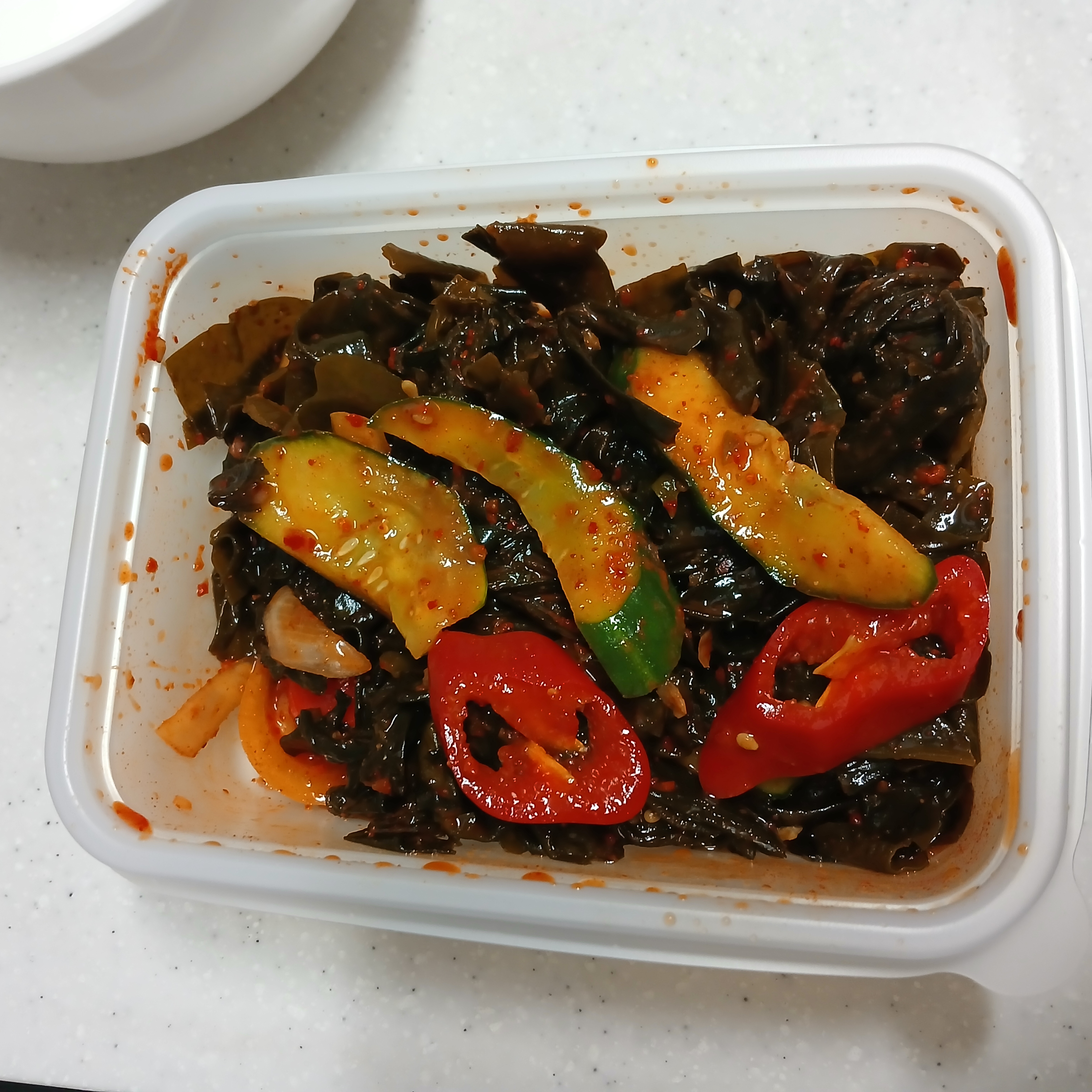 | 원재료명 및 함량 | 미역52.1%(국내산),오이15.6%(국내산),양파10.4%(국내산),숙성양념장10.4%{고추장{물엿,정제수,소맥분(미국,호주산),고추양념[고춧가루6.2%,정제소금,마늘,양파/중국산],밀쌀(미국산),정제소금},고춧가루(국내산),맛술(쌀:수입산,주정:국내산,수입산),양파,무,대파,양파청,매실청,설탕,간장,마늘},식초3.6%,천일염2.6%(국내산),볶음참깨2.6%,홍고추,설탕/대두,밀 함유 |