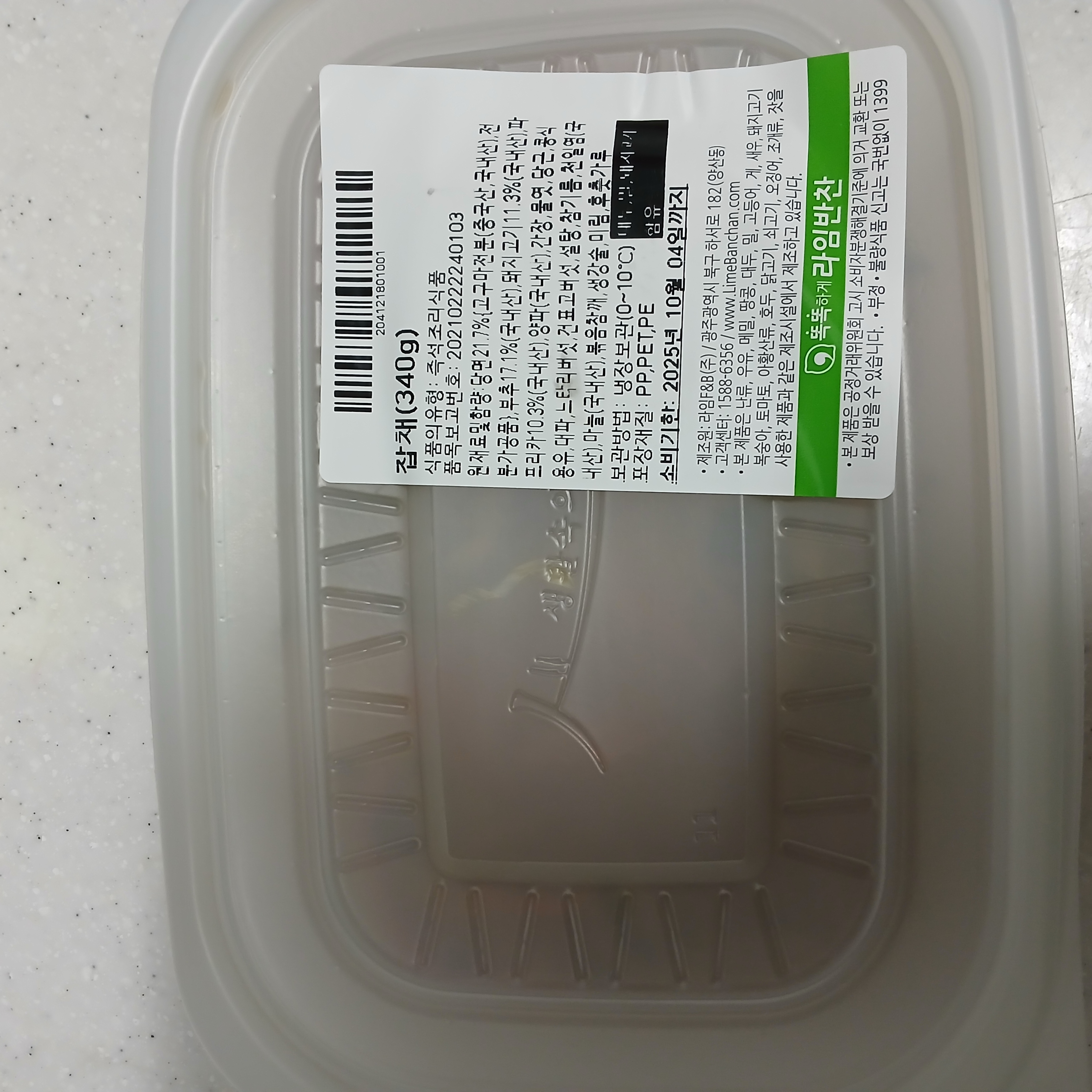 원재료명 및 함량 | 당면21.7%{고구마전분(중국산,국내산),전분가공품},시금치17.1%(국내산),돈안심11.3%(국내산),파프리카10.3%(국내산),양파7.7%(국내산),간장7%,물엿7%,당근5.5%,콩식용유3.9%,대파4.2%,건표고버섯,느타리버섯,설탕,참기름,천일염,마늘,볶음참깨,생강술,미림,후춧가루/대두,밀,돼지고기 함유 |
