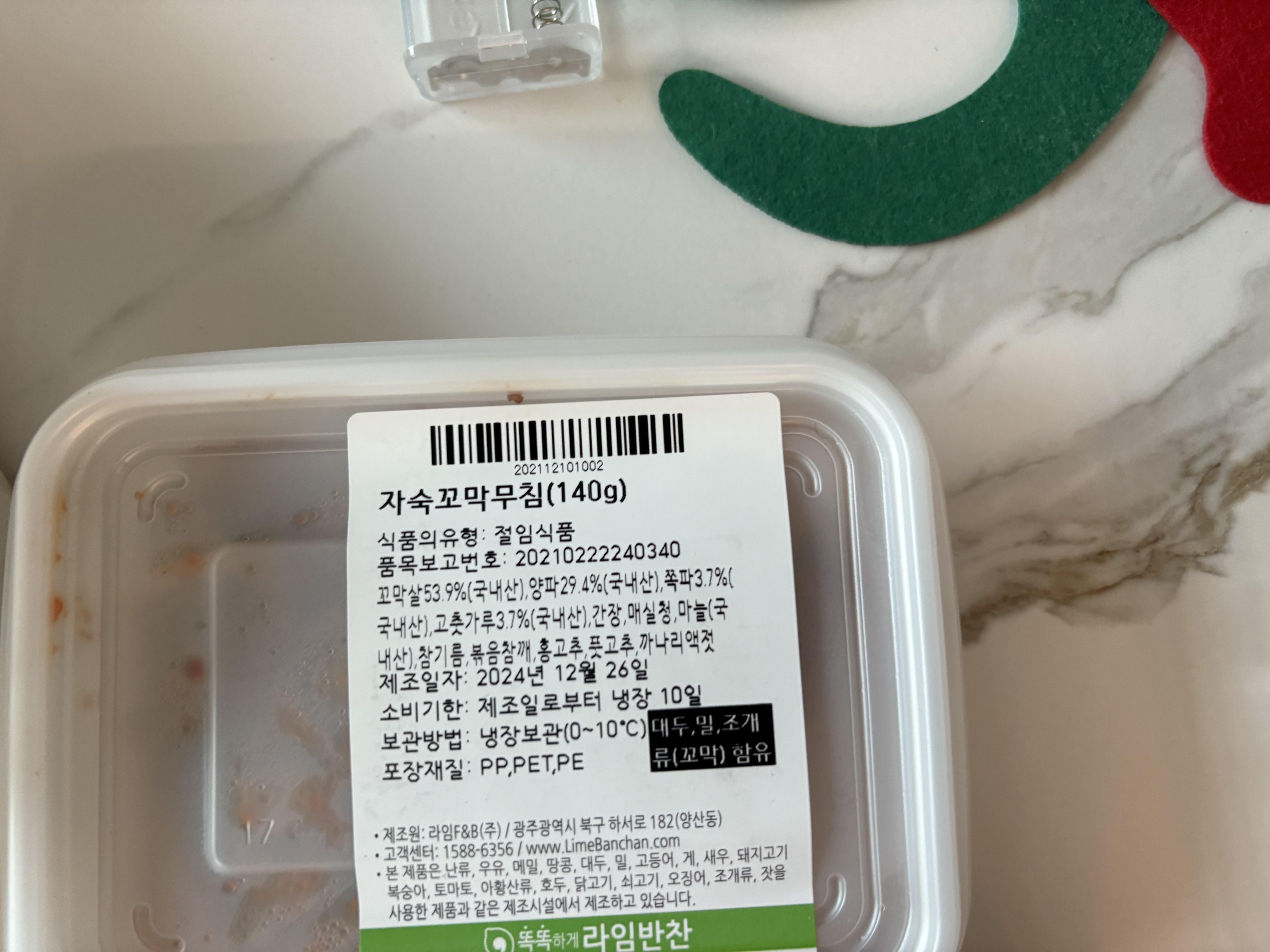 원재료명 및 함량 | 꼬막살53.9%(국내산),양파29.4%(국내산),쪽파3.7%(국내산),고춧가루3.7%(국내산),간장,매실청,마늘,참기름,볶음참깨,홍고추,풋고추,까나리액젓/ 대두,밀,조개류(꼬막)함유 |