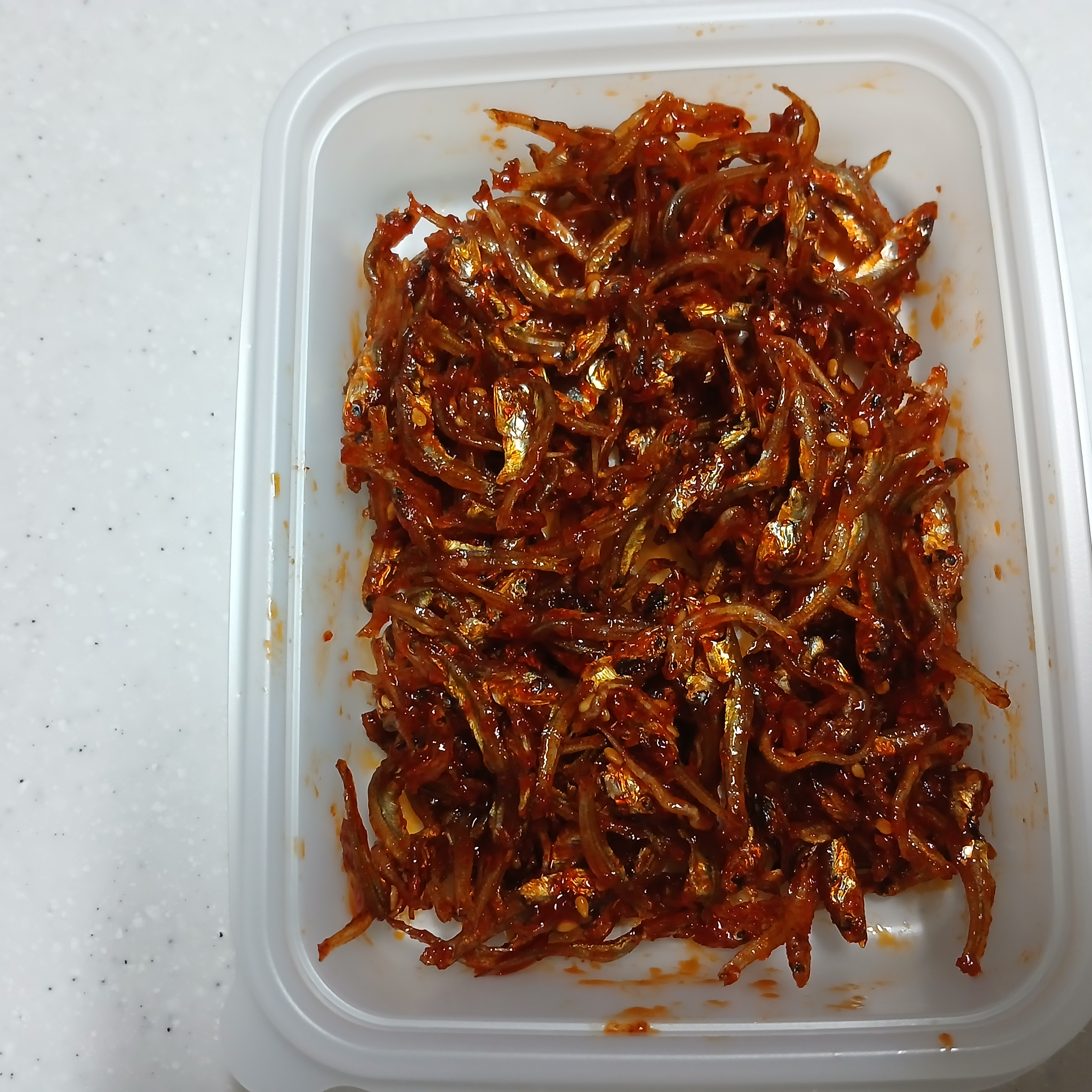 | 원재료명 및 함량 | 가이리멸치45.3%(국내산),양파기름13.6%{콩식용유(대두유:수입산),양파(국내산)},매실청9.1%{농축매실추출액(매실:국내산),갈색설탕,정제수,액상과당,올리고당},물엿9.1%,설탕6%,고추장6%{물엿,정제수,소맥분(미국,호주산),고추양념[고춧가루6.2%,정제소금,마늘,양파/중국산],밀쌀(미국산),정제소금},고춧가루3%(국내산),참기름2.4%,풋고추2.4%,꿀,볶음참깨/대두,밀 함유 |